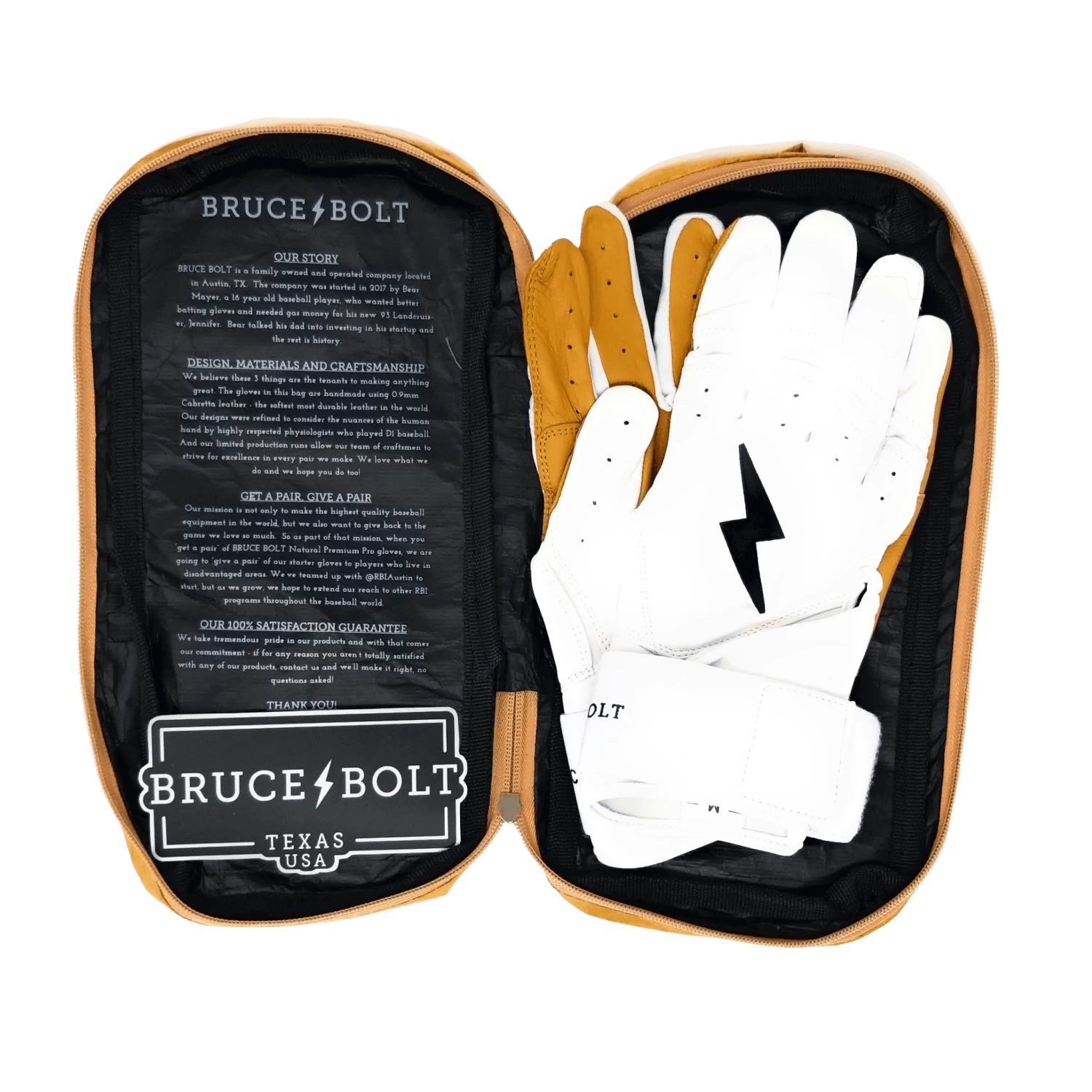 BRUCE BOLT is the newest name in baseball. Their White Premium Pro Long Cuff batting gloves are some of the highest quality, best fitting, most durable gloves in the game. They’re made from the ultra premium 0.9mm Cabretta leather and feature a proprietary Double Inverse Cuff System which creates a more powerful swing and unmatched wrist support at the point of contact. Each pair of BRUCE+BOLT gloves are handmade by highly skilled craftsmen. It’s unlike any other glove out there.