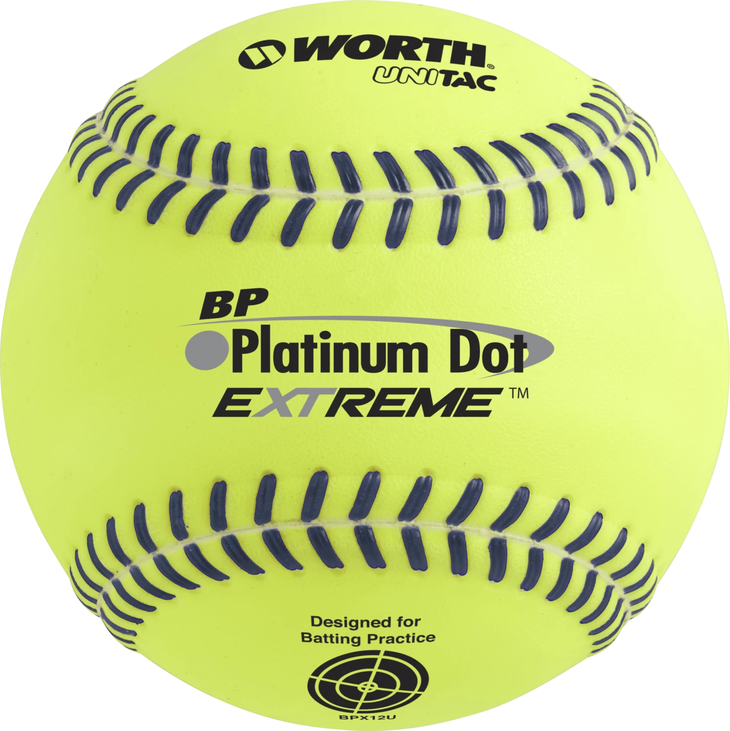 Introducing the new Platinum Standard in BP Balls. Worth’s new Super Platinum Dot Extreme Batting Practice Ball is a one piece, seamless ball that changes the way you take BP. Utilizing Worth’s new UNITAC cover technology, recreate your game swings with a ball designed to hold COR and Compression while minimizing damage on your bats.Â